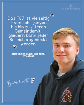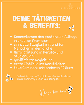 Das FSJ richtet sich an junge Katholikinnen und Katholiken im Alter von 15 bis 26 Jahren. Es ermöglicht ihnen, unter fachlicher Anleitung die vielfältigen Aufgaben pastoraler Arbeit in einer Pfarreiengemeinschaft kennenzulernen. Einsatzfelder sind beispielsweise die kirchliche Jugendarbeit, die Vorbereitung auf Erstkommunion und Firmung, Tätigkeiten im Kindergarten, die Mitwirkung am Pfarrbrief, die Gestaltung von Gottesdiensten oder auch Besuchsdienste, etwa im Krankenhaus.
