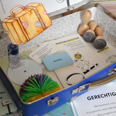 Der Wertereisekoffer der Bayerische Landeszentrale für politische Bildungsarbeit bietet vielfältige Möglichkeiten, mit Kindern über Werte ins Gespräch zu kommen und demokratisches Denken zu fördern. Im Mittelpunkt steht dabei das dialogische Arbeiten: Kinder setzen sich eigenständig mit Wertvorstellungen auseinander, tauschen sich aus und entwickeln Orientierung für ihr eigenes Handeln.